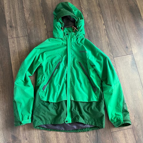 Ultimata outdoor-jackan som funkar från sommar till vinterfjäll, från en tid då klättermusen gjorde robusta plagg som inte är som att bära galon. Synligt använd men utan anmärkningar på funktion. Dragkedjor löper fint, samma med alla elastiska justeringar. Finns några fläckar som säkert försvinner med fläckborttagning. Sömntejpen har släppt på sina håll och dura-coaten är som syns på bilderna flammig. Ingetdera påverkar funktionen och kan åtgärdas av Klättermusen om en önskar.