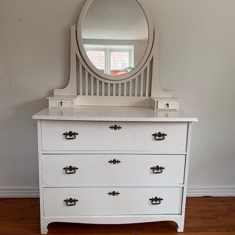 Vit äldre byrå med spegel. Höjd byrådel 80 cm. Tre lådor. Fint använt skick, visst slitage med tanke på ålder, saknas en del på beslaget översta lådan. Massivt trä, troligen från 40-talet. Hämtas på plats.