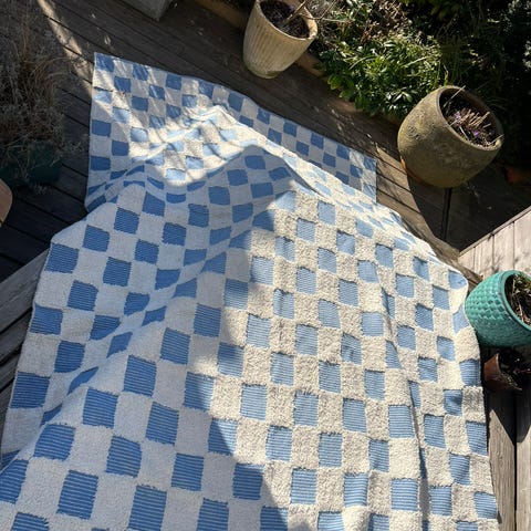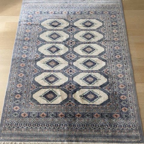 Tuftad ullmatta i ett abstrakt mönster med olika former i färgerna crème, grått och rosa.