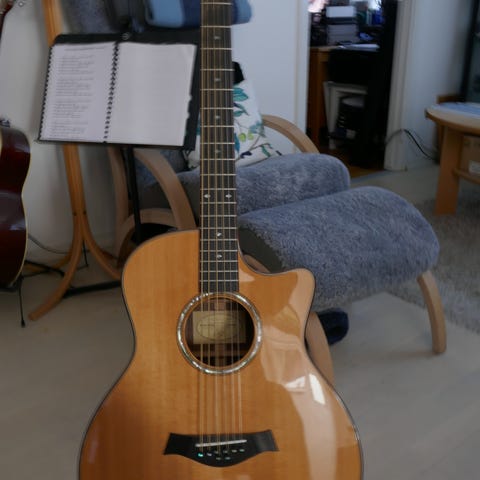 Paul Reed Smith SE AX20E Angelus akustisk gitarr med mycket fin inbyggd mikrofon. Modellen har cutaway-kropp för lättare åtkomst till de högre banden, och halsen har vackra inlägg, se bild.