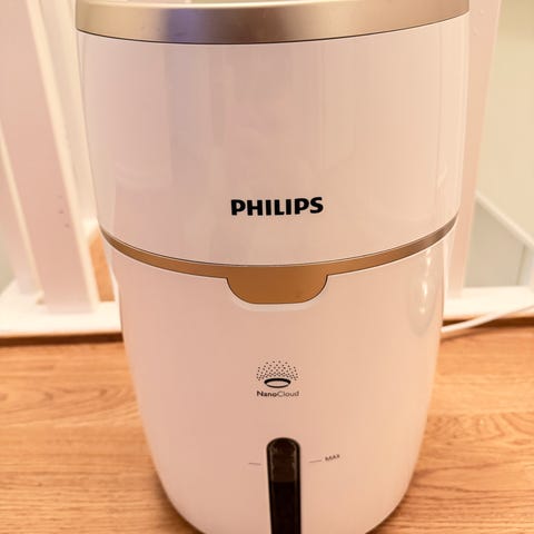 Ovanpå finns touchknappar för av/på, fläkthastighet, timer och önskad fuktnivå. Strömkabel är fast monterad på baksidan.