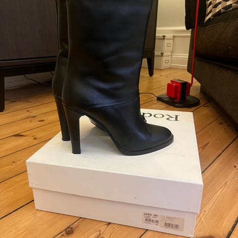 Rodebjer klackskor i storlek 38. Skorna har leopardmönstrad ovandel i beige och svart samt svart skaft och klack. Modellen har spetsig tå och kraftig, vinklad klack. Mycket bekväma! Nypris 4299:- inköpta 2025