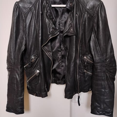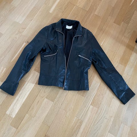 Använd ett fåtal gånger. Har en liten reva på cirka 1 cm, vänster arm (bild, märks knappt) som är lagad/lappade inifrån ärmen hos sömmerska inom läder. Den var där sedan innan.