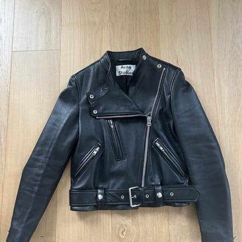Acne skinnjacka, bikermodell, bikerjacka, storlek 36. Svart i skinn med avtagbar krage i shearling. Så det går att välja att ha kragen som fästes med dragkedja och två tryckknappar eller utan.