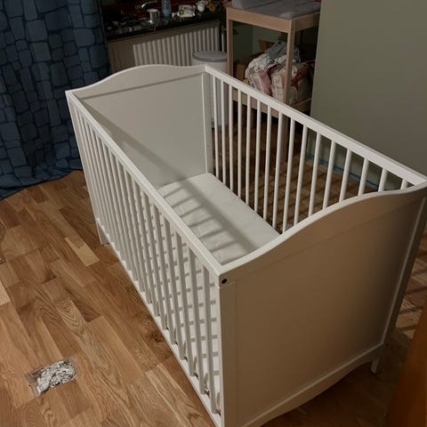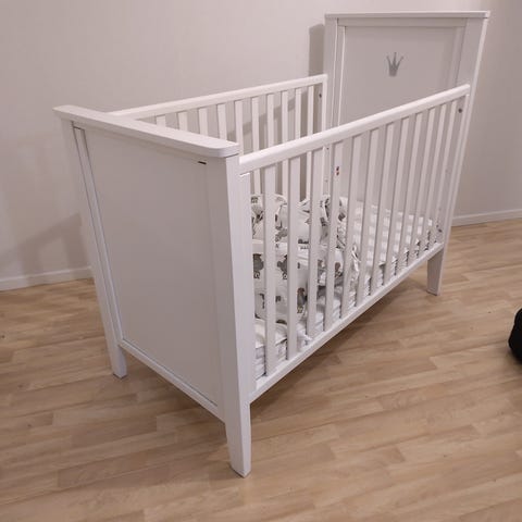 Ingår: madrass, täcke, kudde, spjälskydd, underlakan, påslakan.