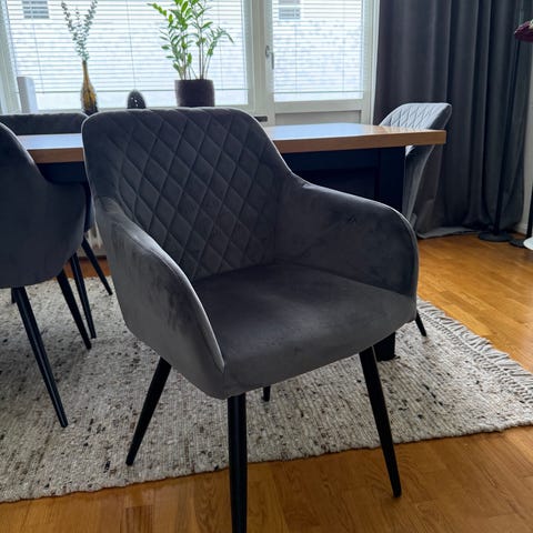 Tio stycken matsalsstolar i modellen Kiwi från Mio säljes. Stolarna är i grå sammet med lätt vadderad sits och eleganta, tunna ben i lackerad metall. Stolarna är även snygga som solitärer till tex sminkbord. De är väldigt sköna och tyget är lätt att rengöra och går att torka av.