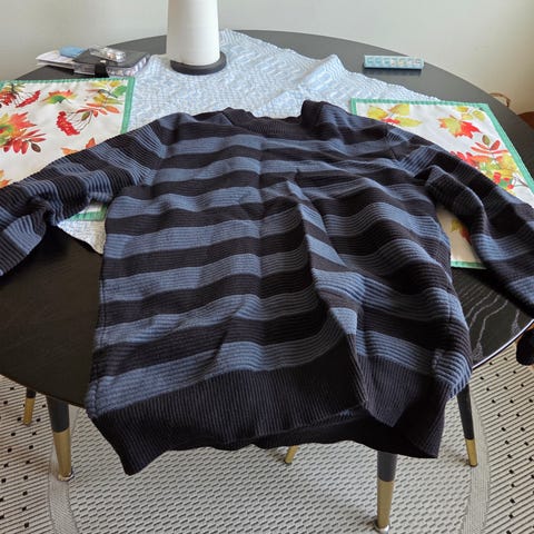Mörkblå stickad tröja i storlek S. Ingen fläck eller skada. Kan hämtas hos mig på Kungsholmen alternativt att vi möts upp i Stockholm för överlämning.