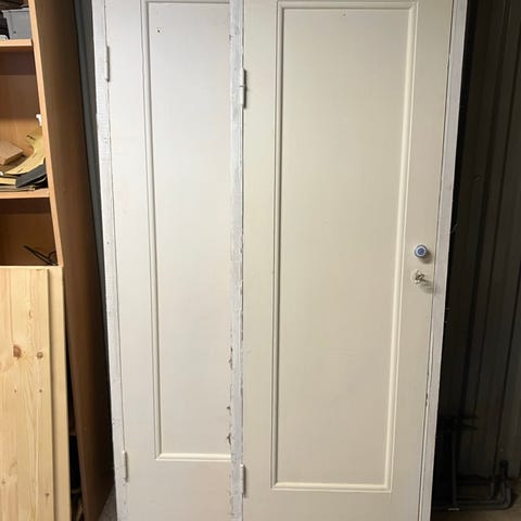 Trädörr med spegelpanel. Dörren är äldre och har slitage samt skador i ytskiktet, vilket gör den lämplig för renovering eller återbruk i exempelvis förråd, verkstad eller som inredningsdetalj. Materialet är trä med profilerad spegel upptill och enklare utförande nedtill. Dörrhandtag och beslag kan behöva kompletteras eller bytas ut beroende på användningsområde.