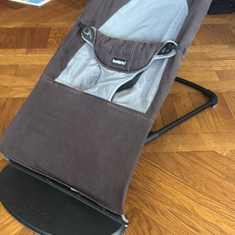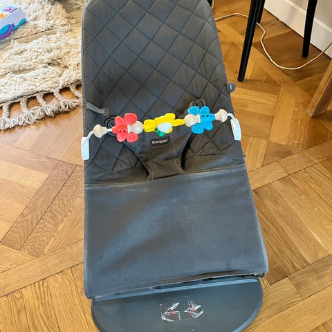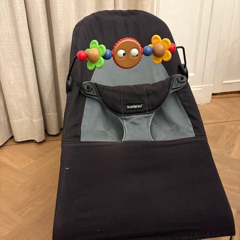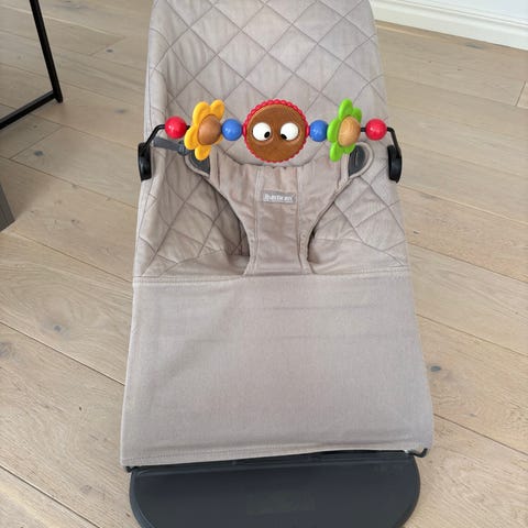 Babybjörn barnstol/babysitter i beige tyg med quiltad sits och metallstativ. Babysittern har trepunktssele och avtagbar leksaksbåge med färgglada träfigurer. Tygklädseln är delvis sliten med en tydlig reva framtill, se bild. Passar som sitt- och viloplats för spädbarn och småbarn enligt tillverkarens rekommendationer. Klädseln är av tyg som kan tas av för rengöring enligt skötselråd från Babybjörn. Nytvättad