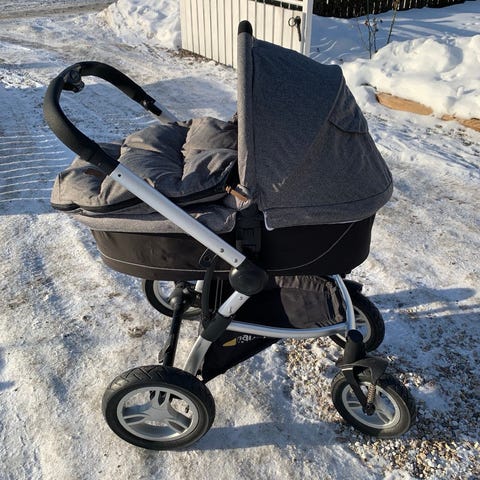 De stora hjulen gör den smidig att köra både i stan och i snö. Barnvagnen är enkel att fälla ihop och tar relativt lite plats vid transport och förvaring.