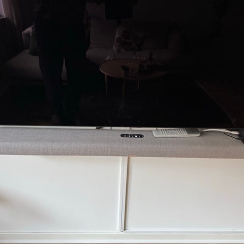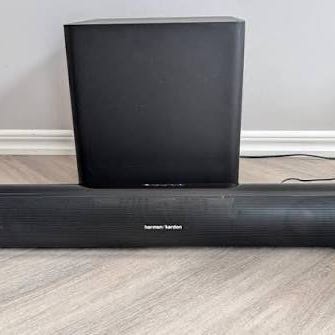 Harman Kardon soundbar med tillhörande subwoofer. Systemet består av en ljudlimpa placerad framför TV:n och en fristående subwoofer för förstärkt basåtergivning. Lämpligt för användning tillsammans med TV och annan hemelektronik för förbättrad ljudupplevelse vid film, serier och musik.