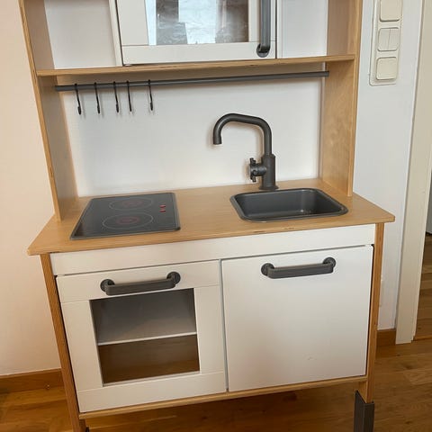 IKEA leksakskök i trä och plast med spishäll, ugn, diskho och hyllplan. Till köket följer ett större antal tillbehör som leksaksmat, köksredskap och serveringsdelar i blandade färger och material. Det ingår även plastkorgar för lek som affär eller matinköp. Passar för barn som vill leka kök och matlagning inomhus. Lamporna i spisen fungerar inte.