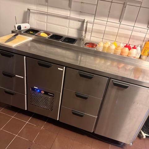 Haglund kylbänk i rostfritt stål för restaurang- eller storkök. Enheten har kylaggregat på kortsidan, 10 utdragslådor med glas för översiktlig förvaring. Bänkskiva i rostfritt stål ger arbetsyta ovanpå kylförvaringen samt ho för vatten eller is.