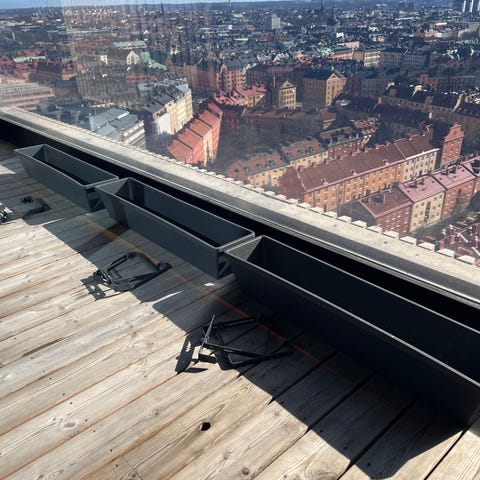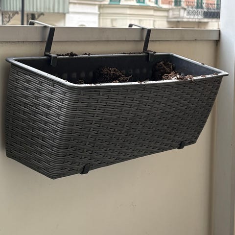 Balkonglåda i beige metall med integrerade krokar för upphängning på räcke. Avlång modell som passar för plantering av blommor, örter eller mindre växter på balkong eller altan. Slät utsida med diskret kant runt om och två fasta upphängningsbyglar på baksidan.