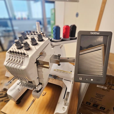 Medföljer ramar i olika storlekar (även några magnetramar), kepsutrustning, instruktionsbok, verktygslåda samt tråd och undertråd enligt bilder. Maskinen står på ett stabilt ekbord som medföljer.