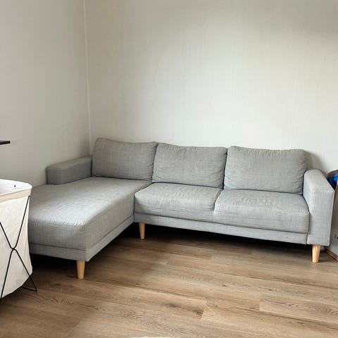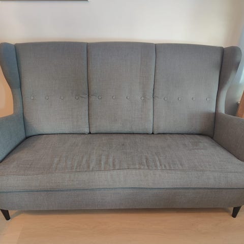 3 sittsoffa. Endast ett och ett halvt år gammal. Mörk beige, hög rygg, sitt vänlig. Ek ben Ej rök familj. Köpt på EM möbler