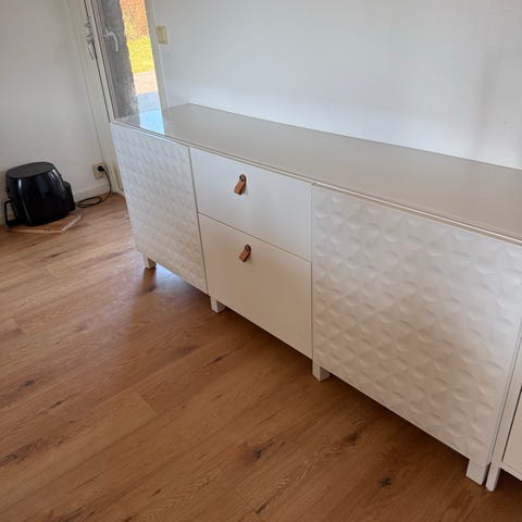 Pga av flytt säljer vi vår fina TV bänk med 2 stora förvaringslådor och dubbla glasluckor (liljemönster bakom glaset går lätt att ta bort om man så önskar)