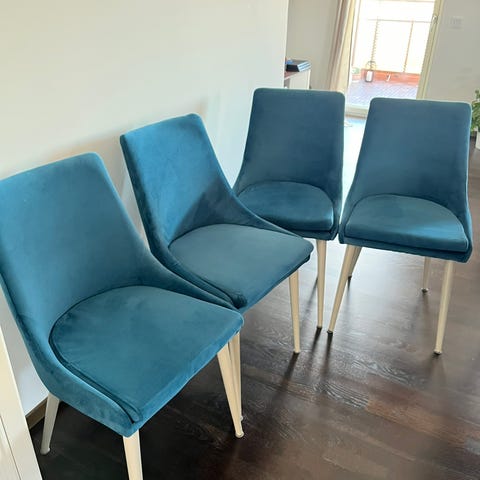 2 stycken mycket välvårdade stolar till matbord eller annan användning i blå sammetsliknande tyg. Lätt stoppning. Ben i ekfärg av metall. Inga fläckar eller skador. Använts som extrastolar.