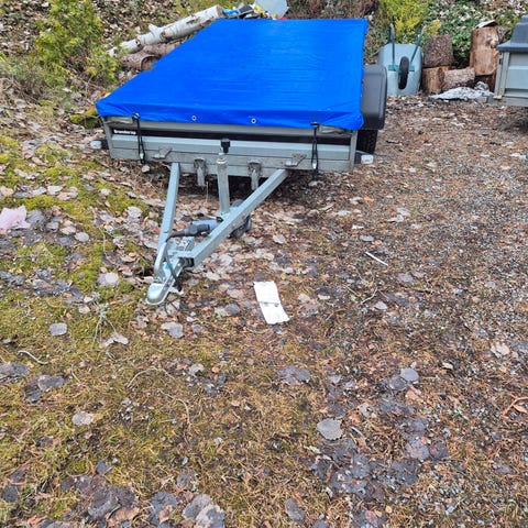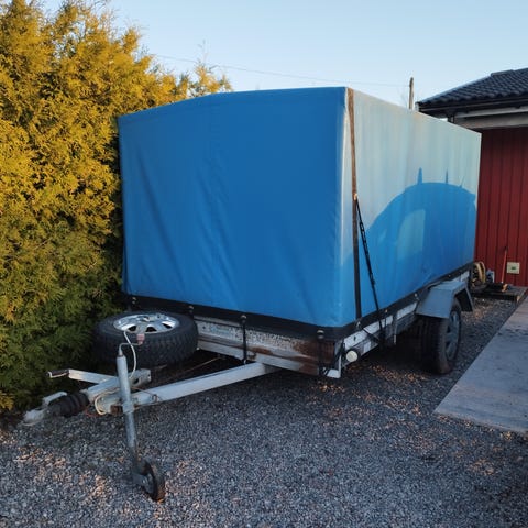 Släpvagn med kapellock och uppkörningsramp. Vagnen har tippbar dragstång. Passar för transport av exempelvis byggmaterial, trädgårdsavfall eller mindre maskiner. Enaxlad konstruktion med dragkrok för personbil.