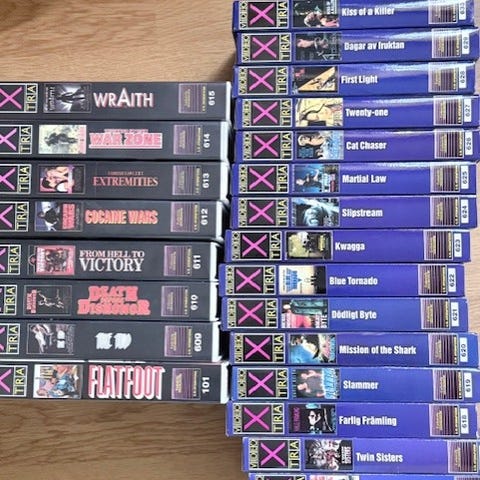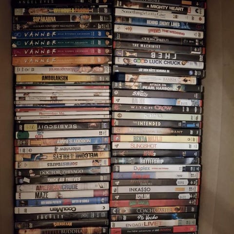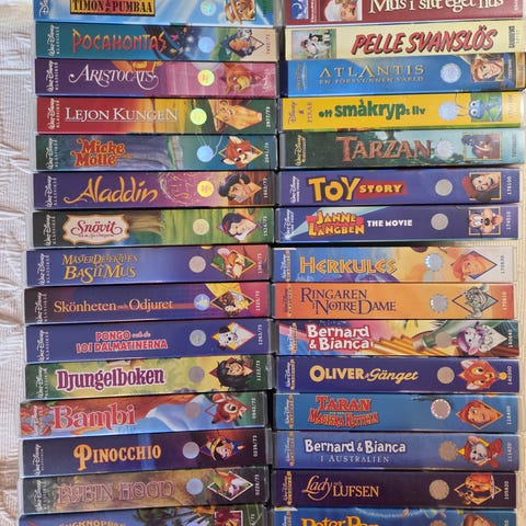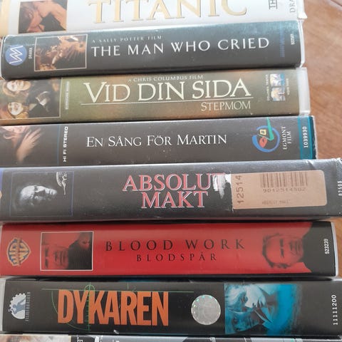 Paket med blandade VHS-filmer. Filmerna är av olika titlar och genrer, bland annat komedi, drama och action. Fodral och kassetter är av standard plastmaterial. Lämpligt för den som samlar på eller använder VHS-format.