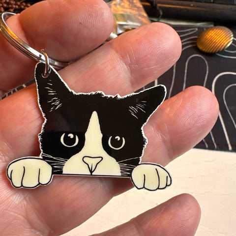 Pokémon nyckelring med motiv av figuren Meowth. Nyckelringen är utformad som en platt berlock i metall med färglagd framsida. Passar för unisex-användning och kan användas till nycklar, väskor eller som accessoar.