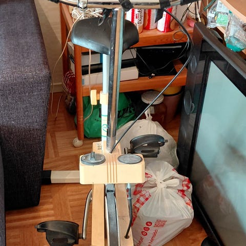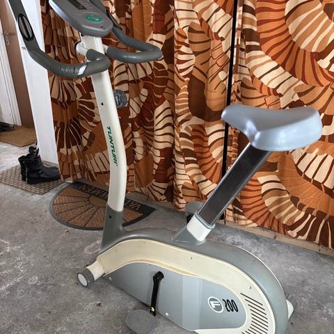 En extremt gammal träningscykel, den har nästan bara använts som prydnad…MEN den funkar! Det går lite trögt å styret saknar en lite mutter.
