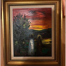 Oljemålning på pannå föreställande ett sidoporträtt av en kvinna med röd sjal mot en landskapsbakgrund med hus och träd. Färgerna domineras av rött, gult och bruna toner. Målningen är inramad i en enkel träram och har upphängningsvajer på baksidan. Signatur finns på framsidan i nedre vänstra hörnet.