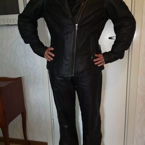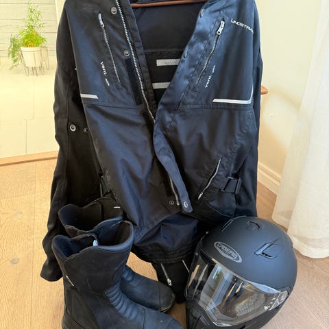 Jacka Held m foder stl XL, byxor jeans Held kevlar stl 36, ryggskydd Halvarssons, skor stl 45, hjälm Nolan N86 stl XXL och handskar i skinn stl 10.
