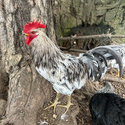 Brahma tupp i flerfärgad fjäderdräkt. Tuppen har kraftig kroppstyp och befjädrade ben, typiskt för rasen. Lämplig som avelstupp eller sällskap i hönsflock. Har kläckts upp i maskin. Född 3 oktober 2025.