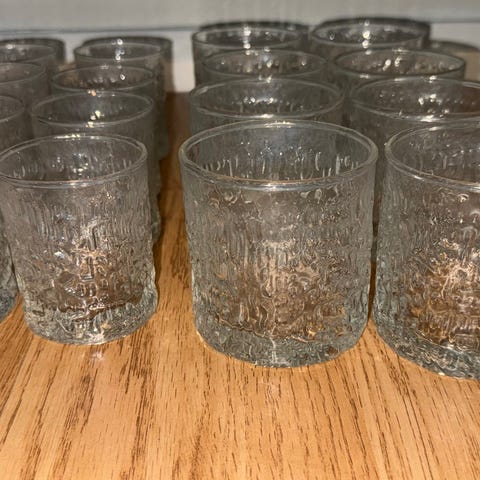 Shotglas i glas med gulddekor upptill och tryck med olika spritmotiv på utsidan. Setet består av flera små glas som lämpar sig för servering av snaps eller andra starka drycker. Passar för dukning, barservering eller som samlarobjekt för den som gillar glas med etikettmotiv.