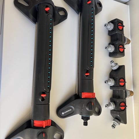 Gardena tryckspruta i turkos och svart med orange detaljer. Sprutan har en slang och ett handtag för enkel användning. Den är utrustad med en axelrem för bekväm transport.