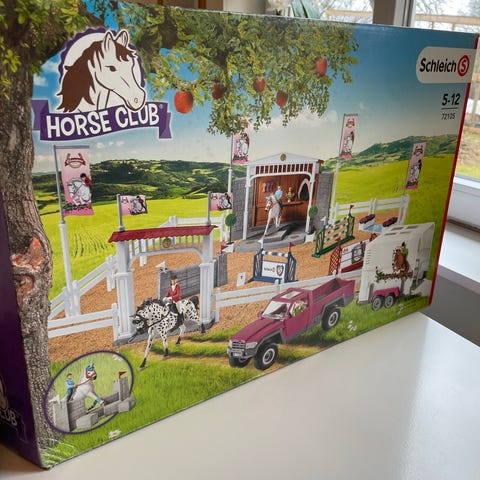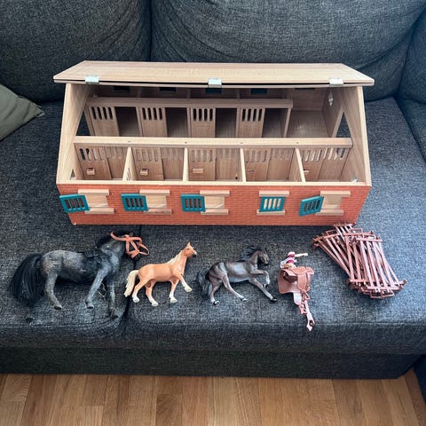 Schleich stall leksaksstall med flera schleich hästfigurer och tillbehör. Setet innehåller ett stallhus med öppningsbara dörrar och boxar, flera hästar i olika färger, staketdelar, ryttare, sadlar, träns och övriga stalltillbehör. Passar för lek med hästar och stallmiljö i miniatyr.