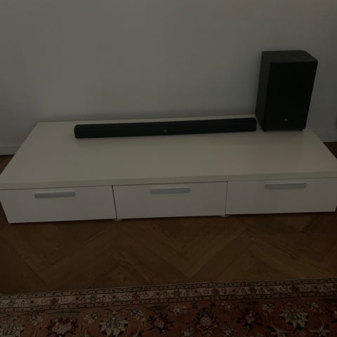 Säljer en stor TV-bänk i vit färg med svart glasskiva i mitten.