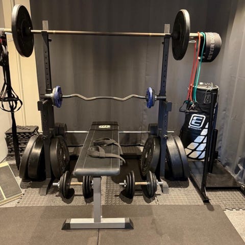 Hemmagym med flera delar för styrke- och konditionsträning. Utrustningen inkluderar ett ställ med flera par hantlar samt viktskivor, en träningsbänk med justerbart ryggstöd, en kabel-/dragmaskin och olika handtag och tillbehör. Passar för helkroppsträning, exempelvis pressövningar, rodd, benövningar och bålträning i hemmamiljö.