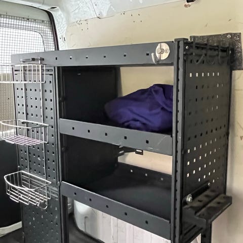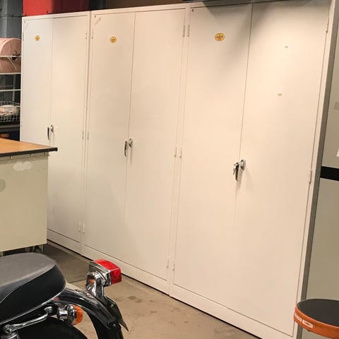 Verkstadshyllor och förvaringsskåp och en verktygstavla