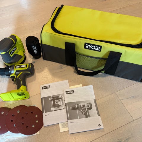Ryobi One+ poler/detaljslipmaskin med ett extra batteri och laddare. Batteridriven maskin i One+-systemet, kompatibel med 18V One+-batterier.