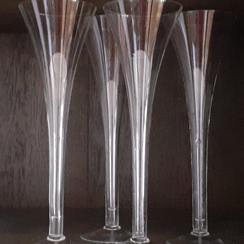 4st höga glas i klarglas. Glasen är cirka 30 cm höga med en öppning på ungefär 9–10 cm i diameter. Konformad kupa och smal, lång fot. Passar exempelvis som dessertglas, drinkglas eller dekorationsglas. Säljes som set om fyra glas.