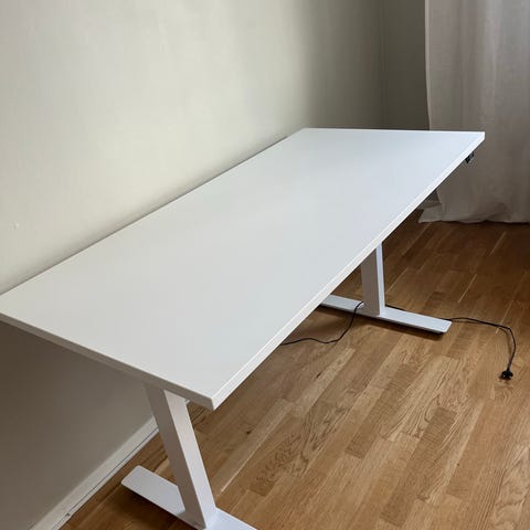 Säljer mitt höj- och sänkbara skrivbord som jag själv byggt. Bordsskivan är handslipad och lackad för hand, vilket ger en riktigt snygg och varm träfinish som sticker ut jämfört med vanliga standardbord.