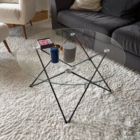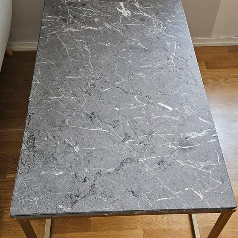 Soffbord med stenskiva (komposit) och stålställning.
