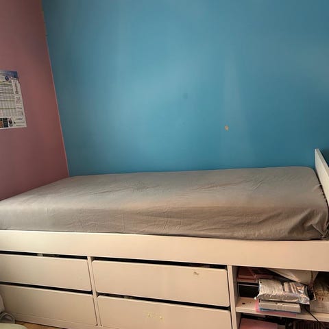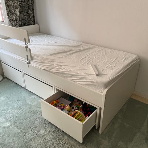Vit IKEA säng med bra förvaring, 90 x 200 cm