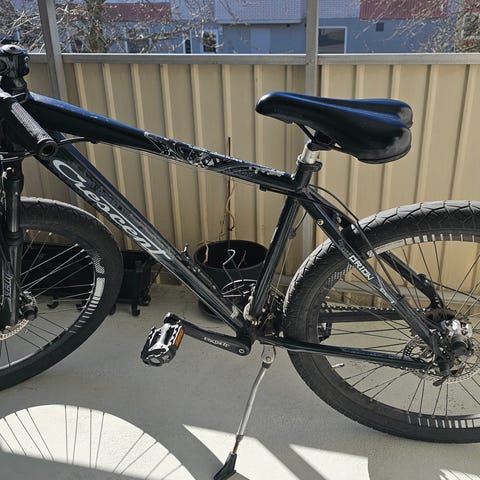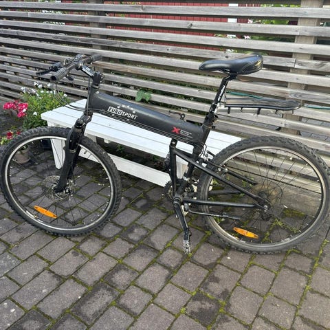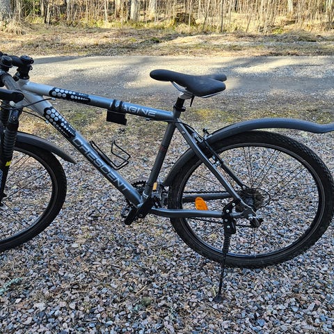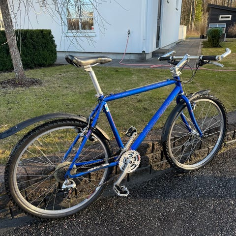 Hjulstorlek 26”. Mountainbike. Ca 20 år gammal men har stått i ett garage de senaste 10-12 åren utan att ha använts. Växlar (21 st) och bromsar fungerar. Stöd, pakethållare, skärmar samt reflexer finns.