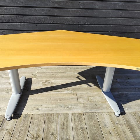 Höj och sänkbart skrivbord. 200 x 100 cm med en halvcirkel på framsidan. Bredden mäter 80 cm där. Bordsmotor från linak. Synliga spår av användning, repor osv. Finns också ett brännmärke efter en lampa på bordsyta.