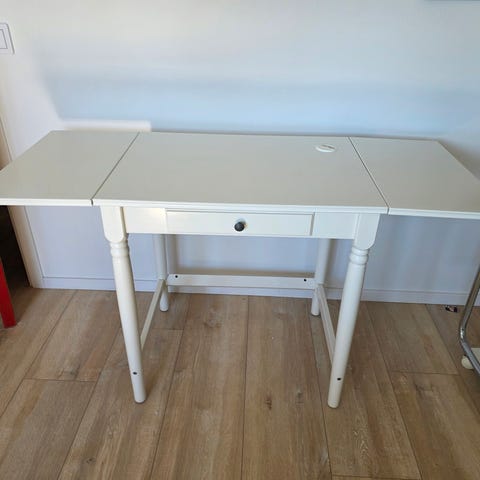 Vitt skrivbord med två lådor och en turkos/blå bänkskiva