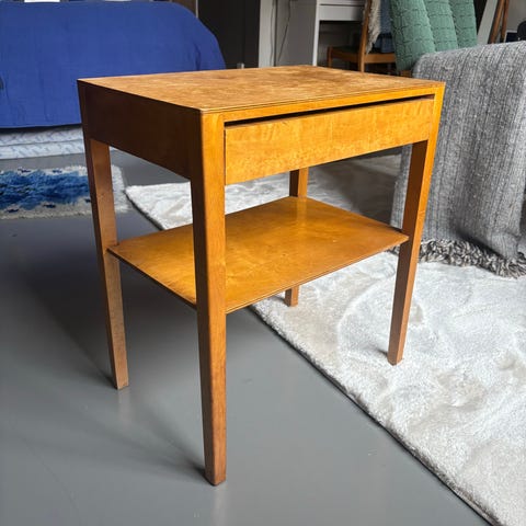 Nattduksbord tillverkat av Ulferts. Fanéren i Alm i mycket gott skick.
