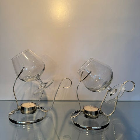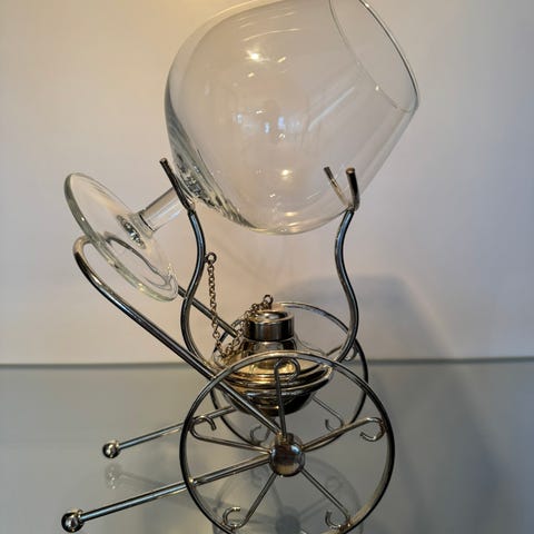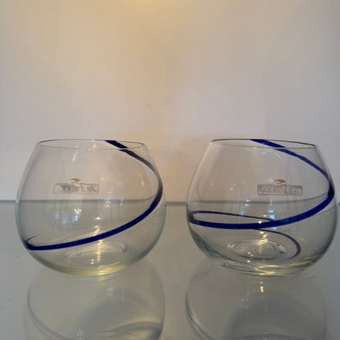 Konjakskupa i glas med rund kupa och fot. Glaset har guldfärgad kant upptill samt dekor med bokstaven N och kransmotiv på framsidan. Höjden är cirka 10 cm enligt måttbandet på bilden. Passar för servering av konjak eller annan spritdryck.
