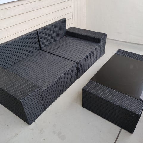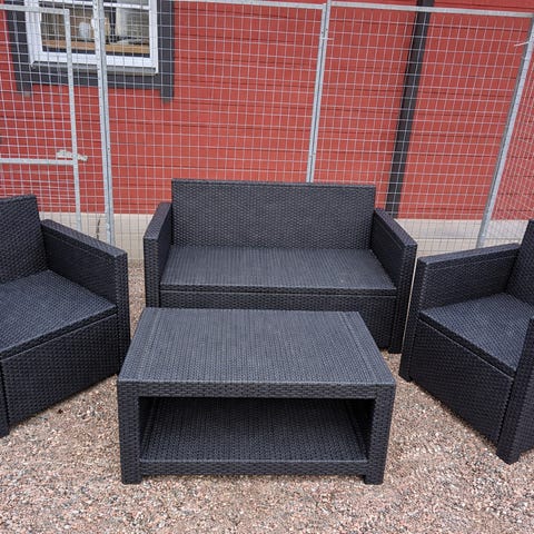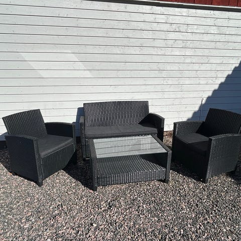 Fin lounge grupp säljes, soffa och 2 fåtöljer med dynor, glas och sidobord. Lånad bild nr 3.