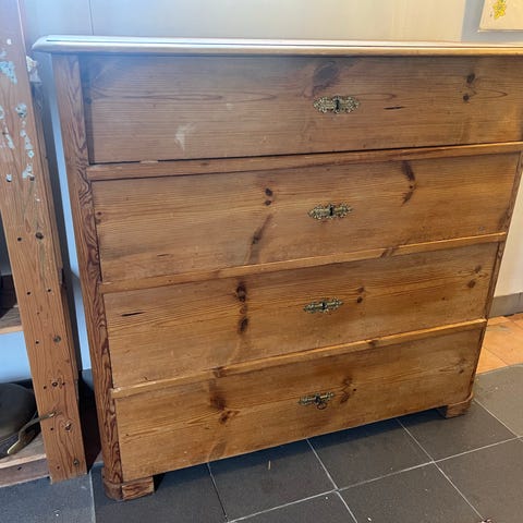 Byrå i furu med fem lådor. Klassisk modell med svarvade ben och metallbeslag på lådorna. Passar för förvaring i sovrum, hall eller vardagsrum. Ytan är lackad furu med synlig trästruktur.