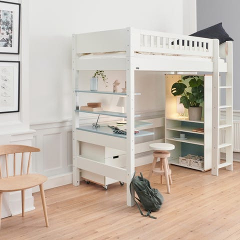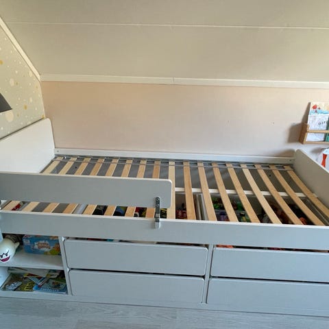 Vit barnsäng med förvaring. Några skador på lådorna och på ramen efter sängsskyddsbrädan (se bilder).