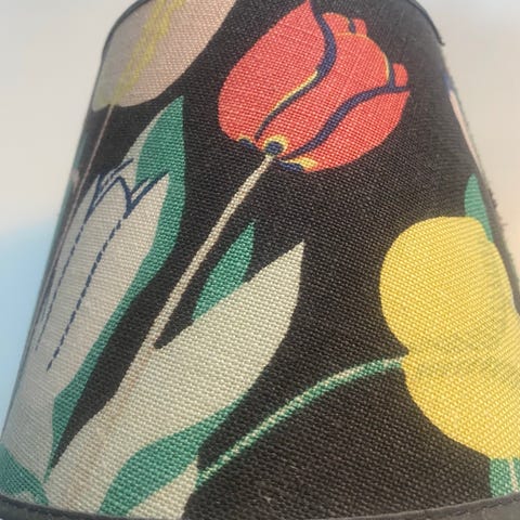 Bergo Sixten 17 lampskärm med mönstrat tyg i bruna, beige och svarta toner. Cylindrisk form med vit insida och metallställning för montering på lampfot. Passar som skärm till bordslampa eller mindre golvlampa.