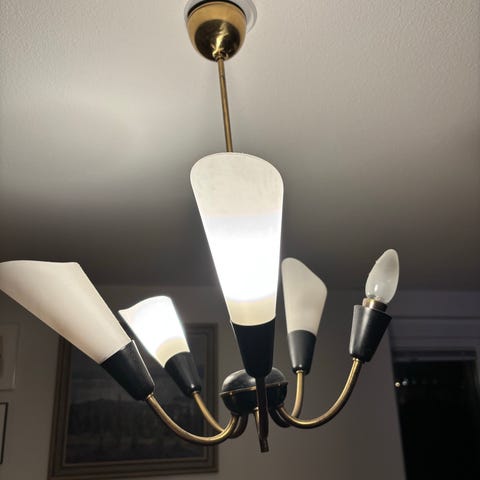 Original taklampa av Hans-Agne Jakobsson, Sverige, ca 1960–70-tal. Elegant och tidlös design i mässing med 6 ljuspunkter och opalglas som ger ett varmt, klart och behagligt ljus.